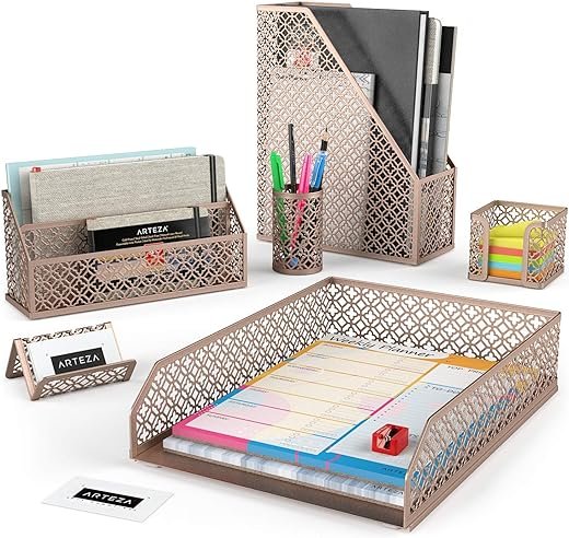 - 6-Piece Desk Organizer Set: Store your office supplies or anything you need to de-clutter in this sleek & stylish rose gold set. Most desk accessory sets only include up to 5 pieces, but this Arteza set has 6: (1) pencil cup holder, (1) letter sorter, (1) letter tray, (1) magazine holder, (1) name card holder, and (1) sticky note holder.