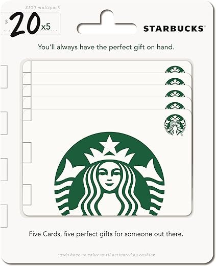 This item includes 5 separate Starbucks gift cards worth $20 each. These cards can be used at most Starbucks locations, making them a convenient way to treat a friend or pre-pay for your own purchases. Please note that there are no returns or refunds on gift cards.