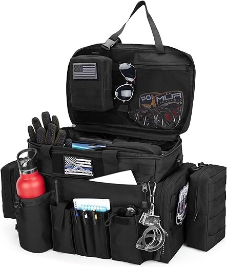 - MULTI-PURPOSE: This police gear bag can be worked as front passenger seat organizer by clips around the head rest and hangs down, so you can easily access things from the driver’s seat. When closed up, easily move from vehicle to vehicle as needed.